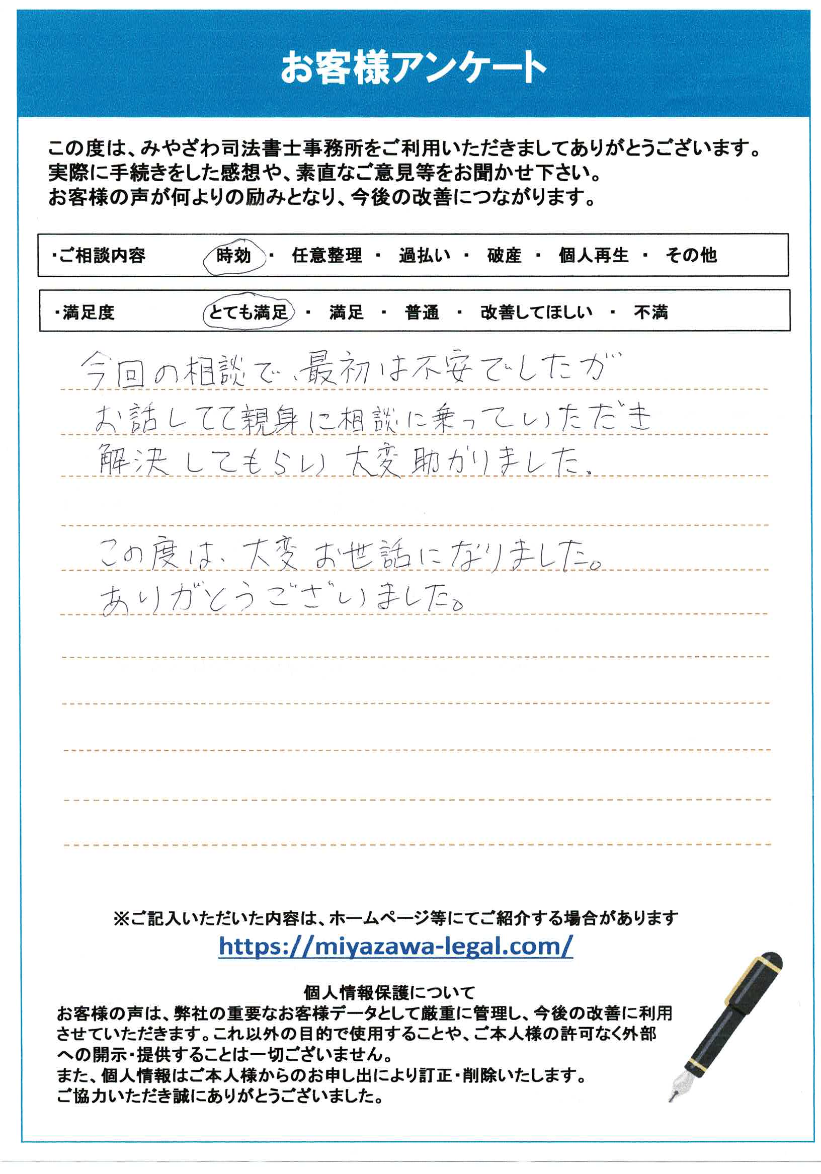 当事務所では、まず時効の成立要件を確認し、必要な書類を整えた上で、適切に時効援用手続きを行いました。その結果、無事に債務が消滅し、N様には「大変、お世話になりました!」と大変満足いただけました。」