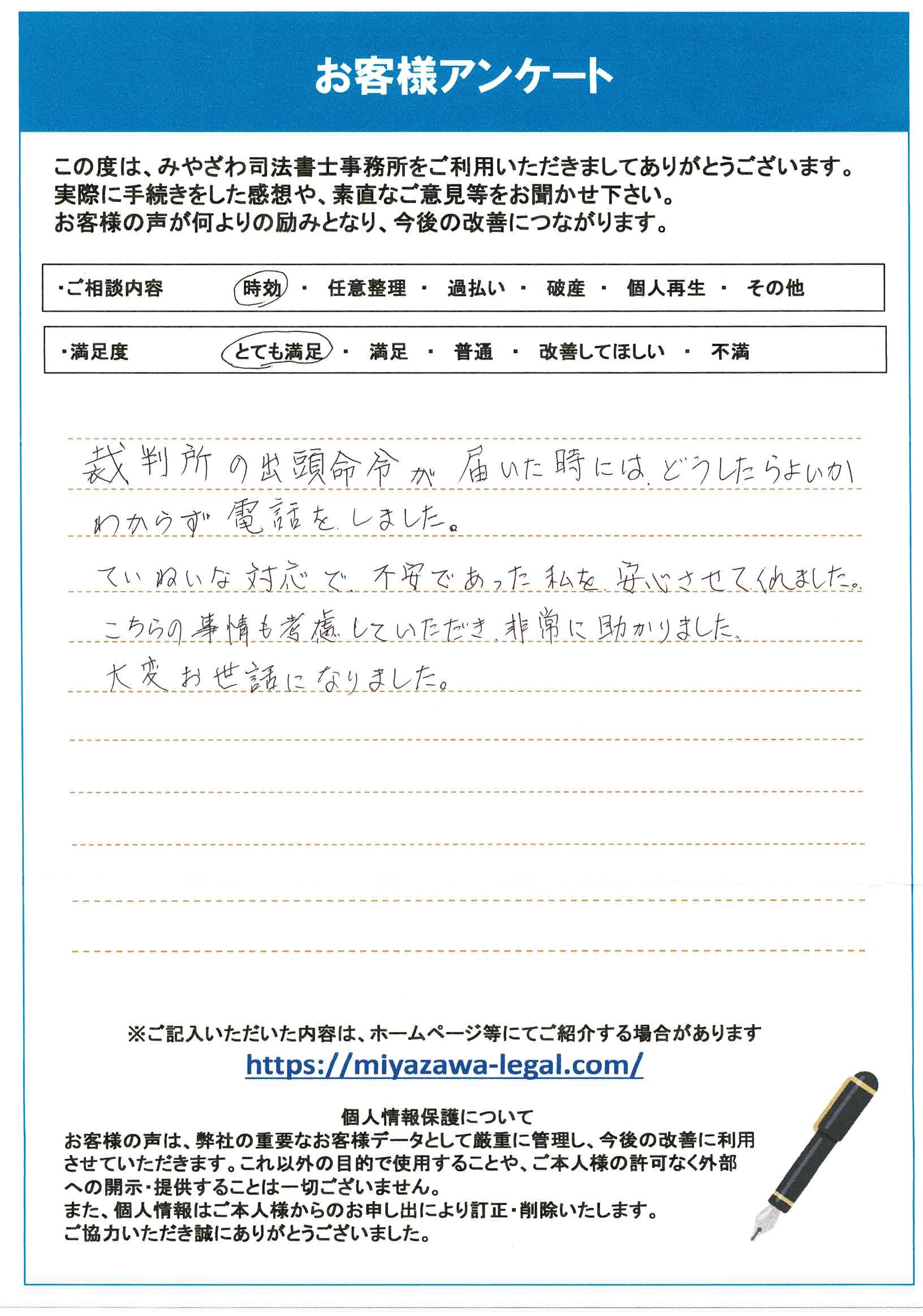 実際にご利用いただいたH様からも「裁判所の出頭命令が届いた時には、どしたらよいか解らず電話をしました。丁寧な対応で、不安であった私を安心させてくれました。」とのご評価をいただいております。