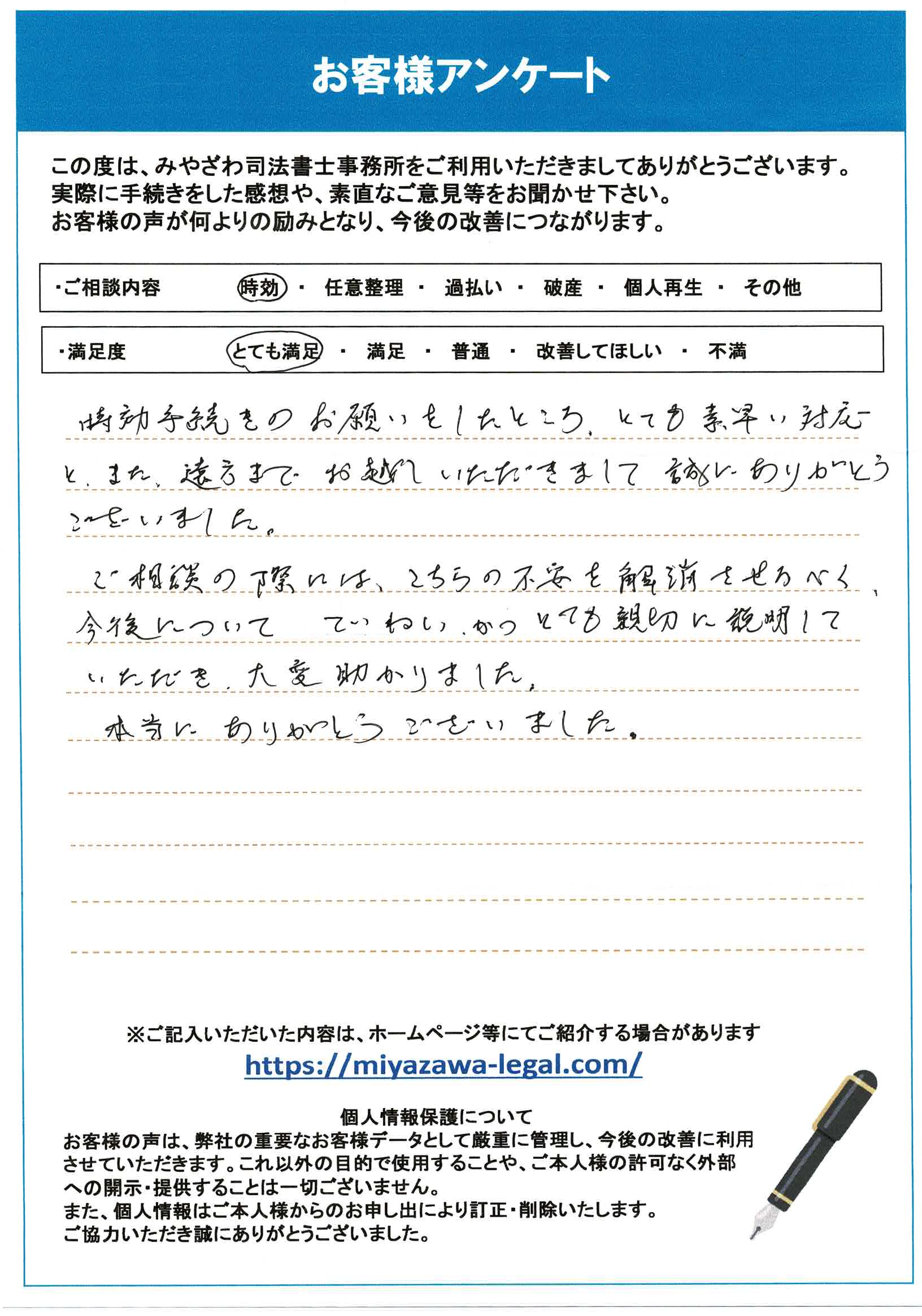 当事務所では、まず時効の成立要件を確認し、必要な書類を整えた上で、適切に時効援用手続きを行いました。その結果、無事に債務が消滅し、O様には「本当にありがとうございました!」と大変満足いただけました。