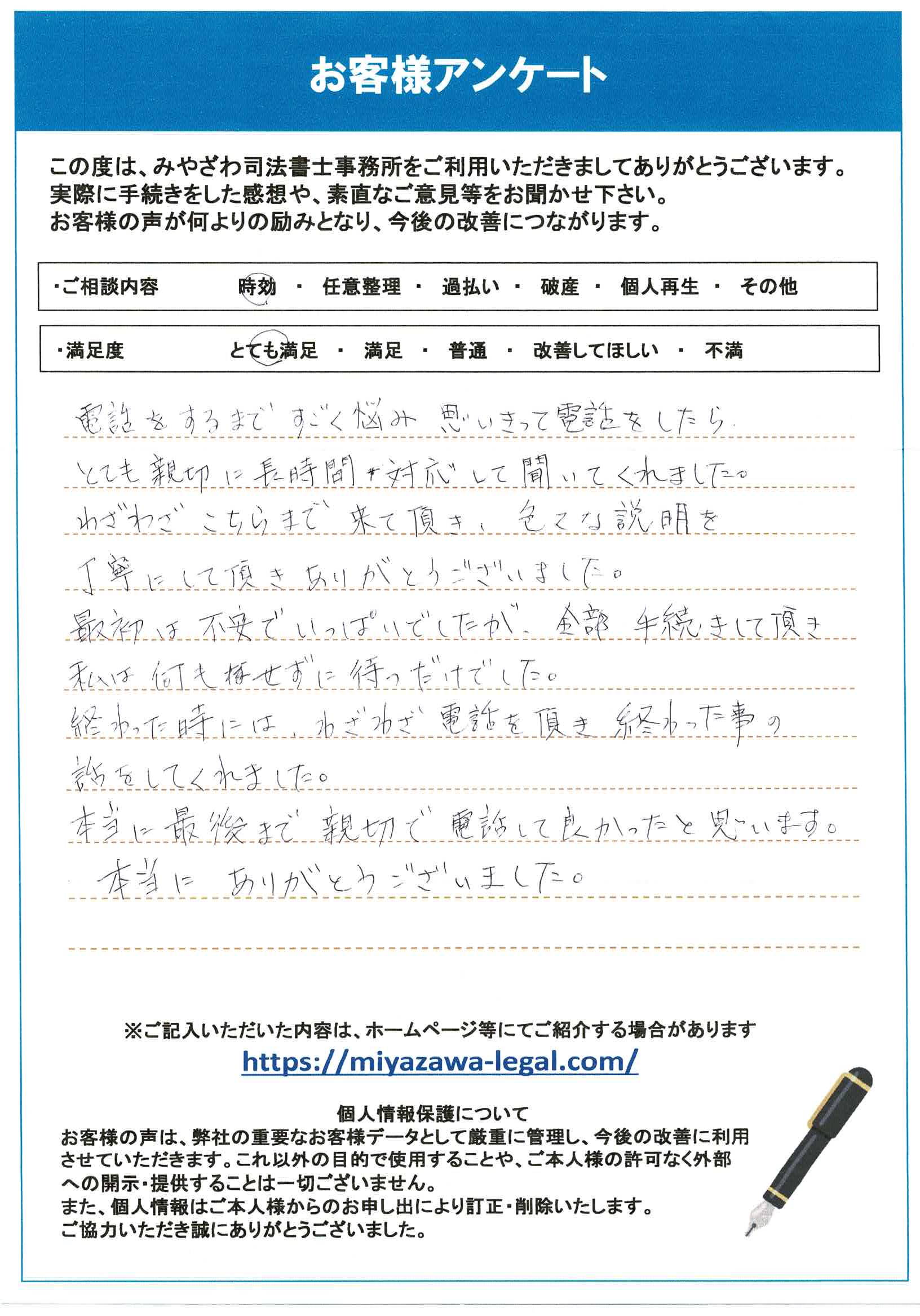 当事務所では、まず時効の成立要件を確認し、必要な書類を整えた上で、適切に時効援用手続きを行いました。その結果、無事に債務が消滅し、U様には「本当にありがとうございました!」と大変満足いただけました。