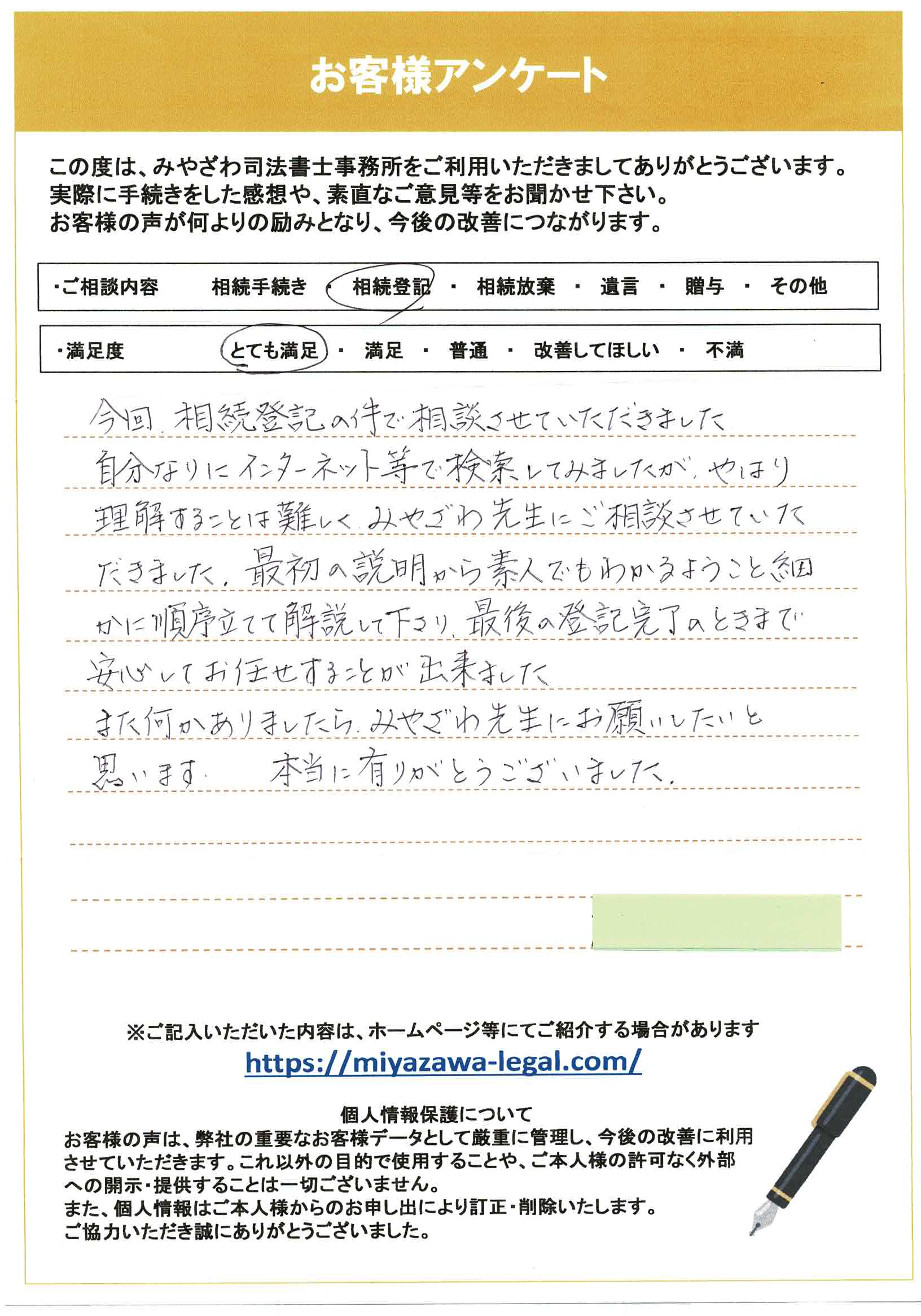 S様からは、「最初の説明から素人でもわかるようこと細かに順序立てて解説して下さり最後の登記完了のときまで安心してお任せすることが出来ました。」とのお声をいただき、「とても満足」の評価を頂戴しました。