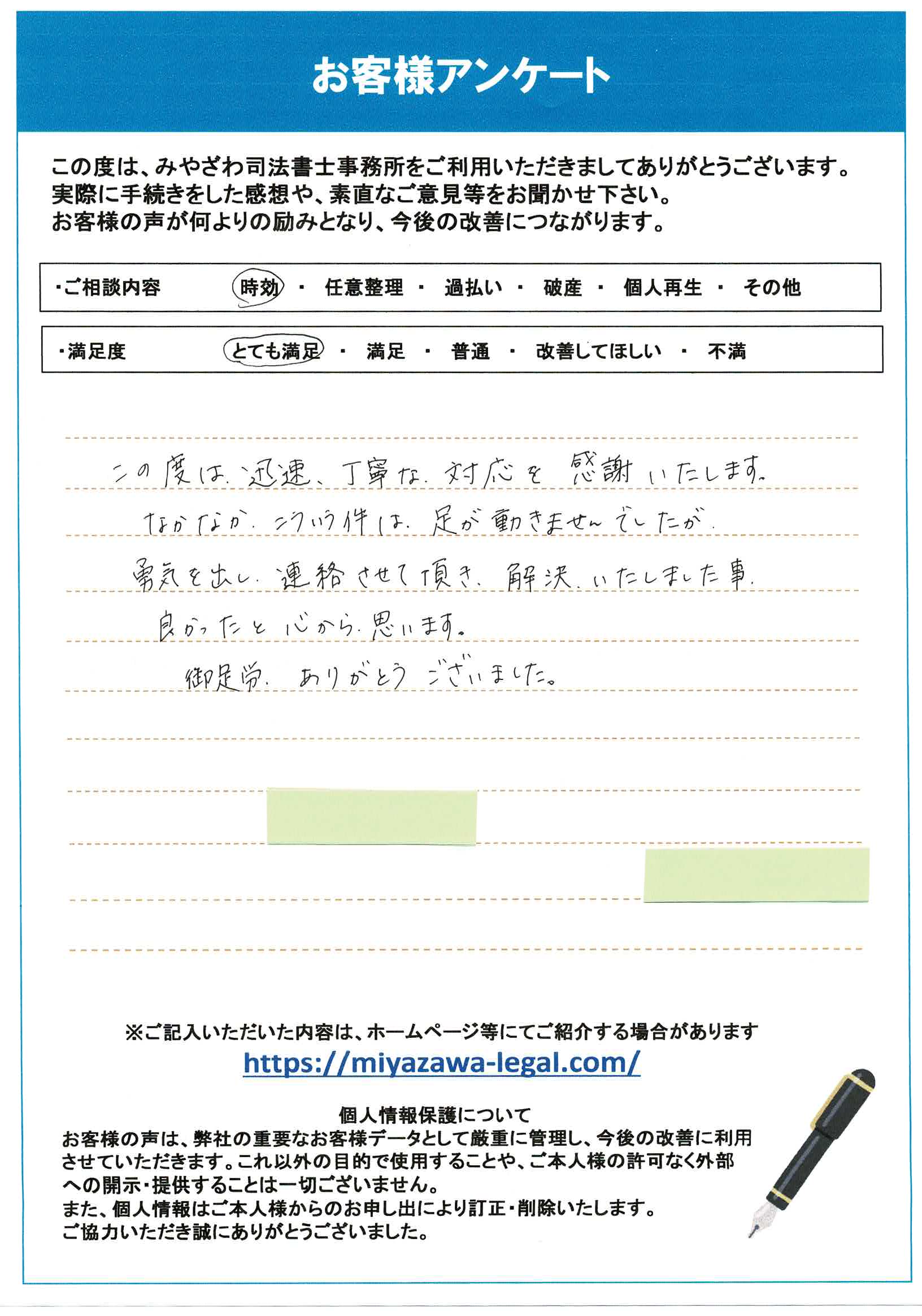 実際にご利用いただいたI様からも「迅速、丁寧な対応を感謝しています。なかなか、こういう件は足が動きませんでしたが勇気を出し連絡させて頂き、解決いたしました事、良かったと心から思います。」とのご評価をいただいております。