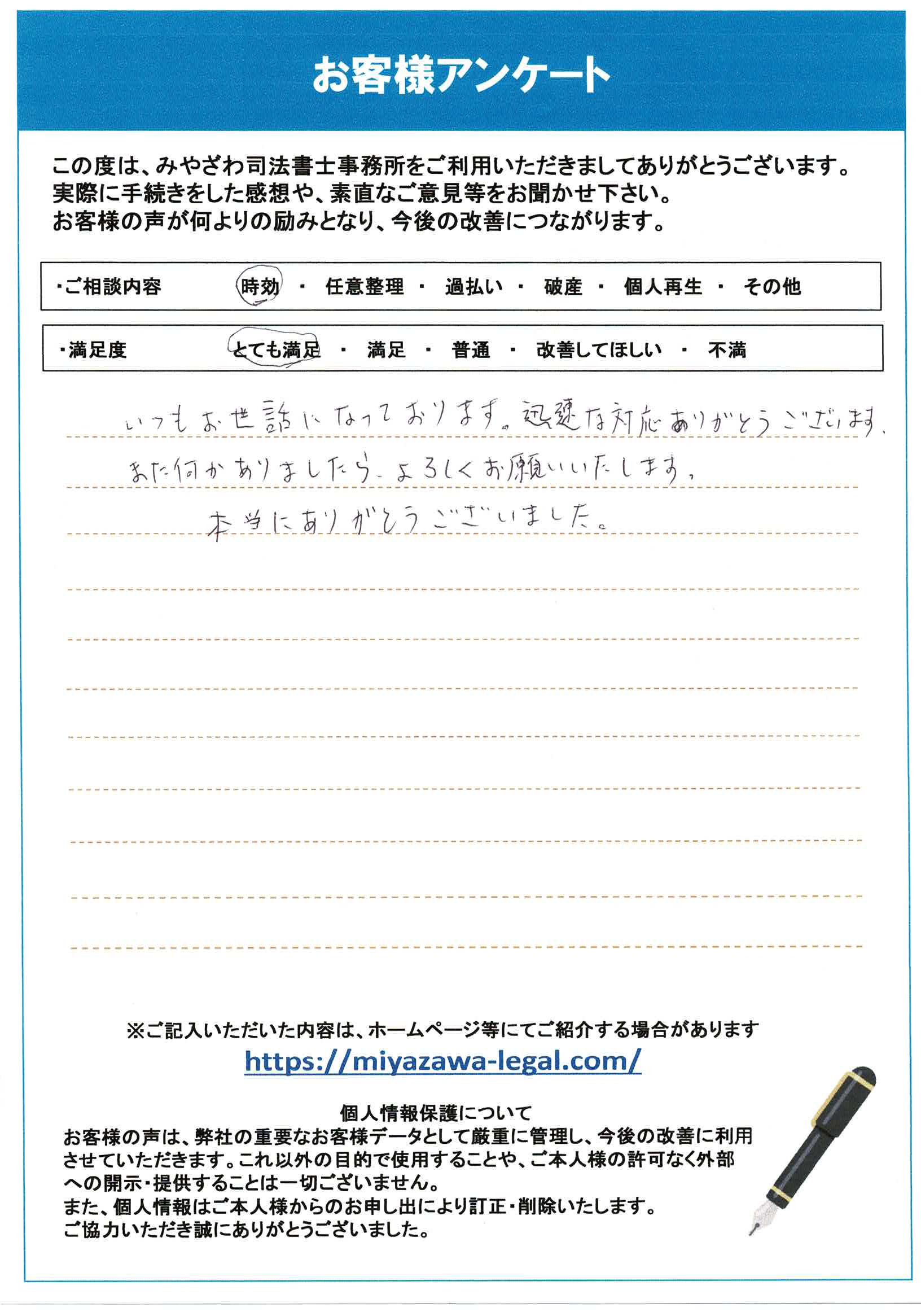 当事務所では、まず時効の成立要件を確認し、必要な書類を整えた上で、適切に時効援用手続きを行いました。その結果、無事に債務が消滅し、N様には「本当にありがとうございました!」と大変満足いただけました。