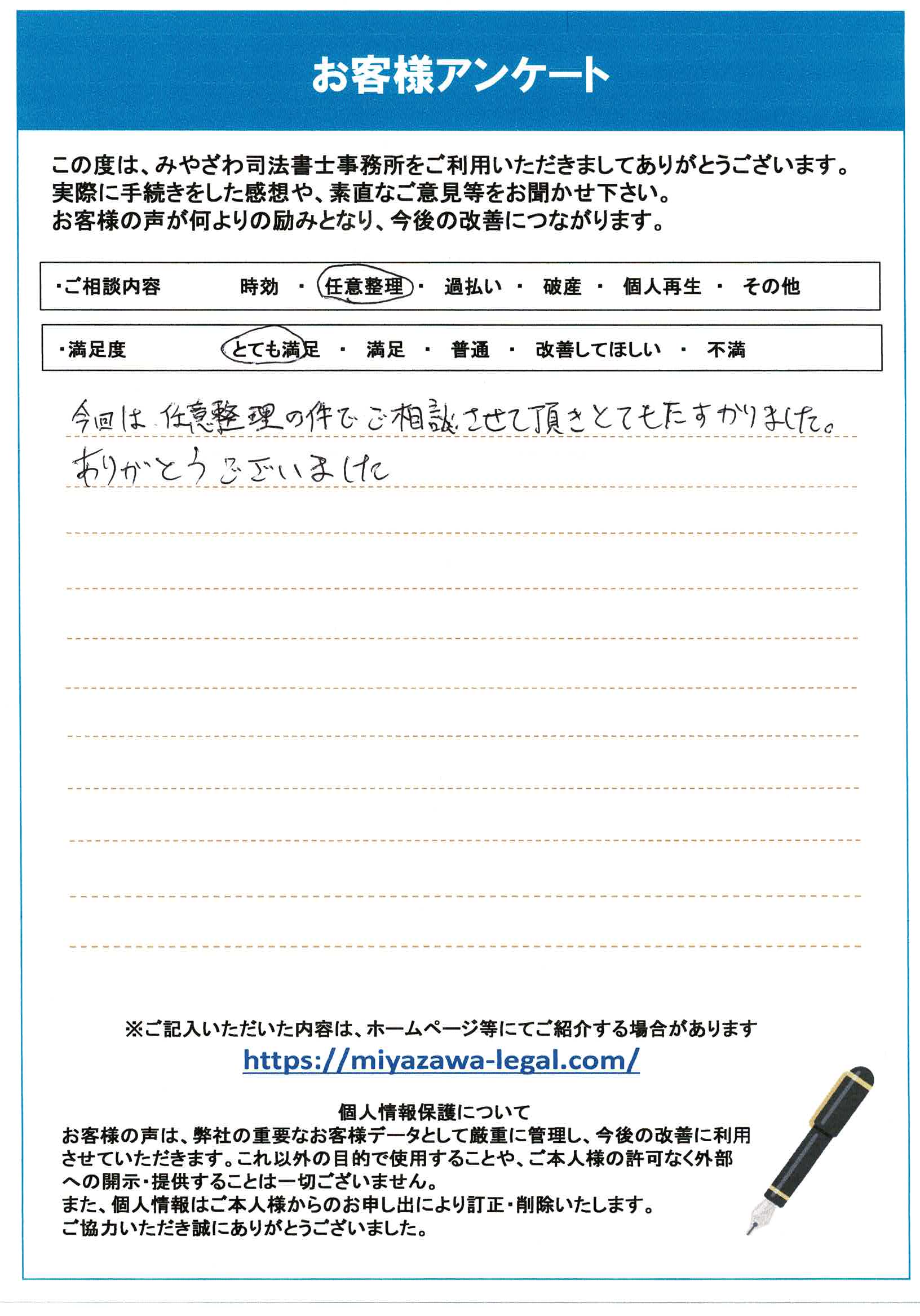 実際にご利用いただいたY様からも「任意整理の件でご相談させて頂きとても助かりました。」とのご評価をいただいております。
