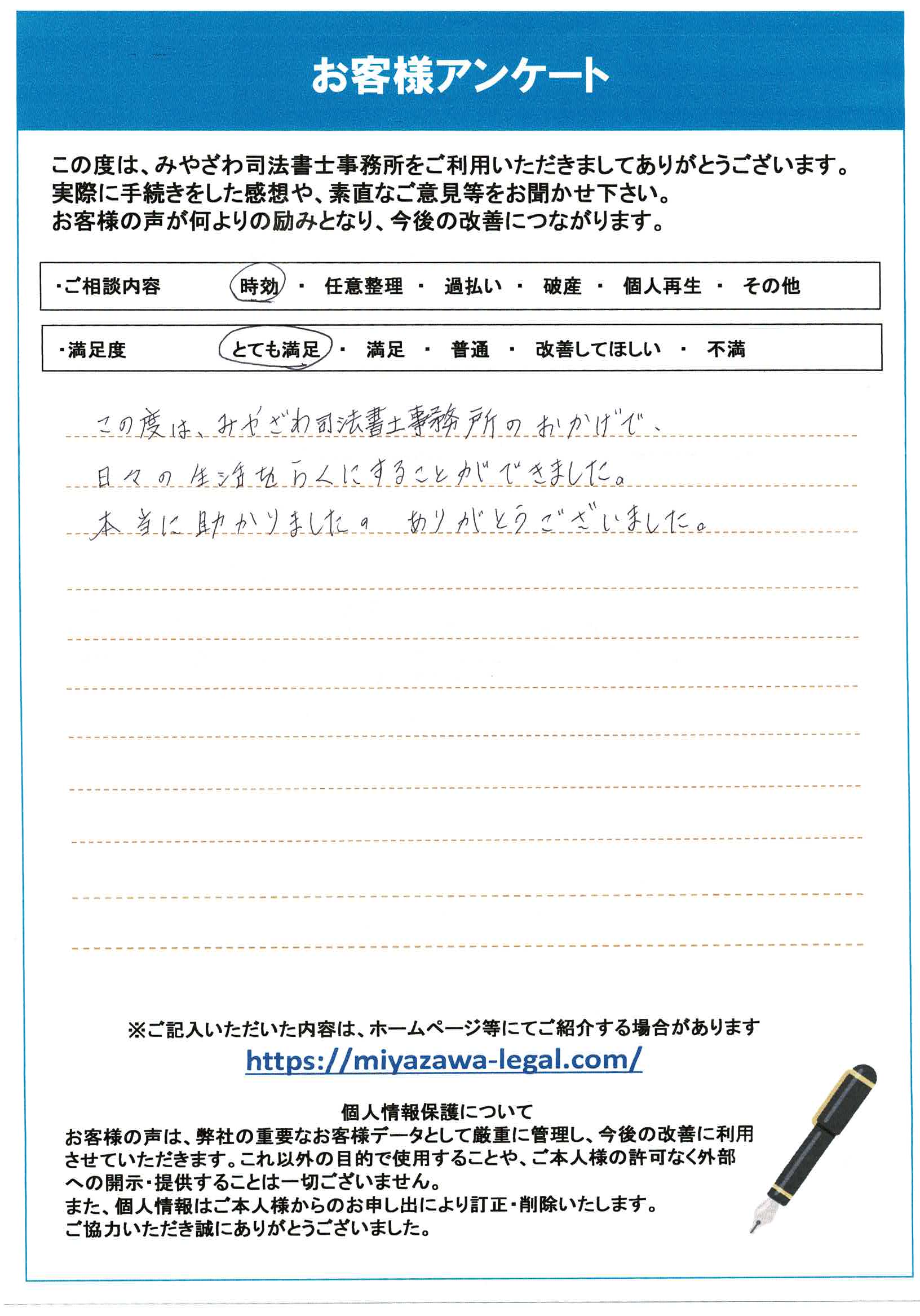 実際にご利用いただいたY様からも「この度は、みやざわ司法書士事務所のおかげで日々の生活を楽にすることができました。本当に助かりました。」とのご評価をいただいております。