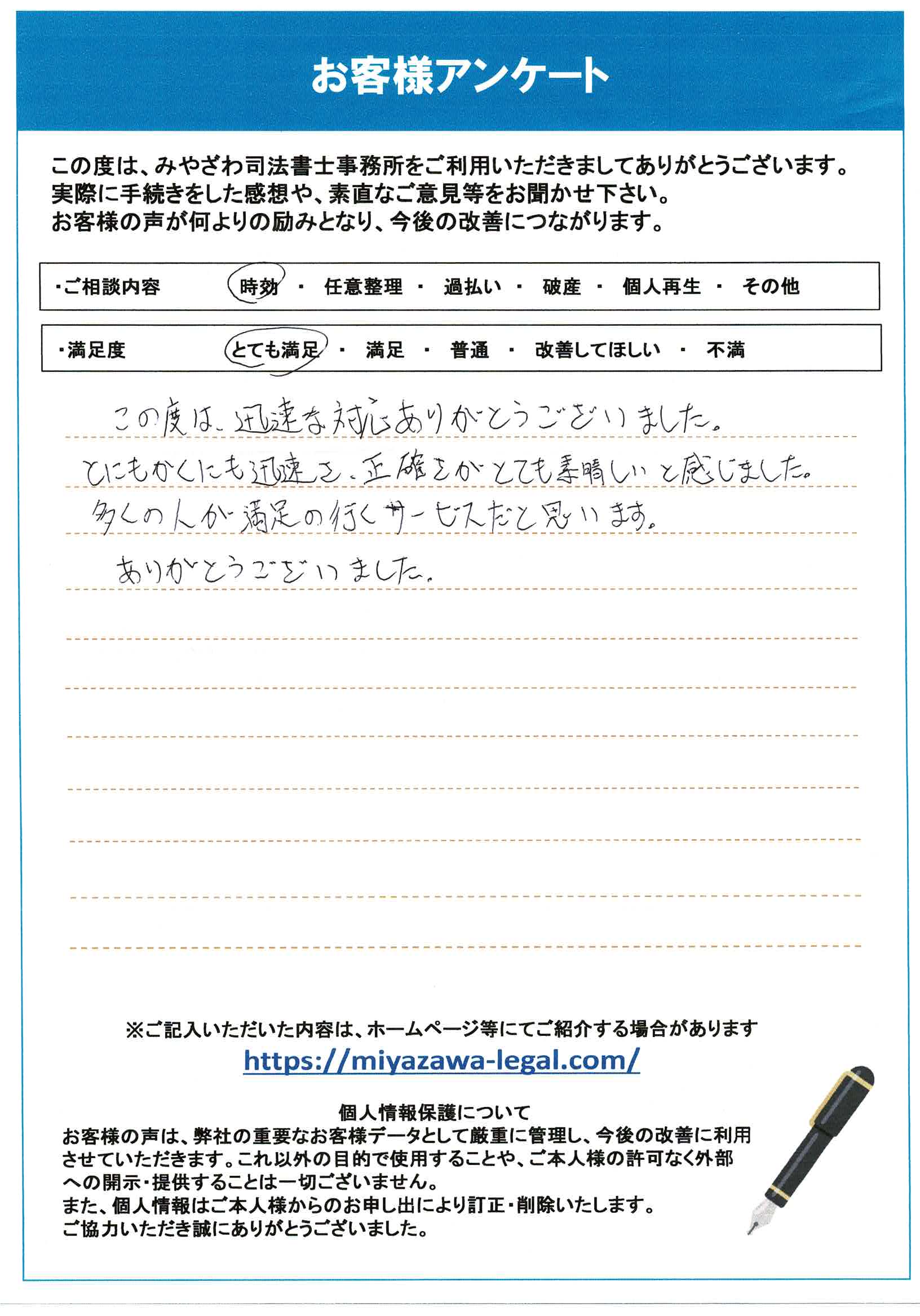 当事務所では、まず時効の成立要件を確認し、必要な書類を整えた上で、適切に時効援用手続きを行いました。その結果、無事に債務が消滅し、I様には「ありがとうございました!」と大変満足いただけました。